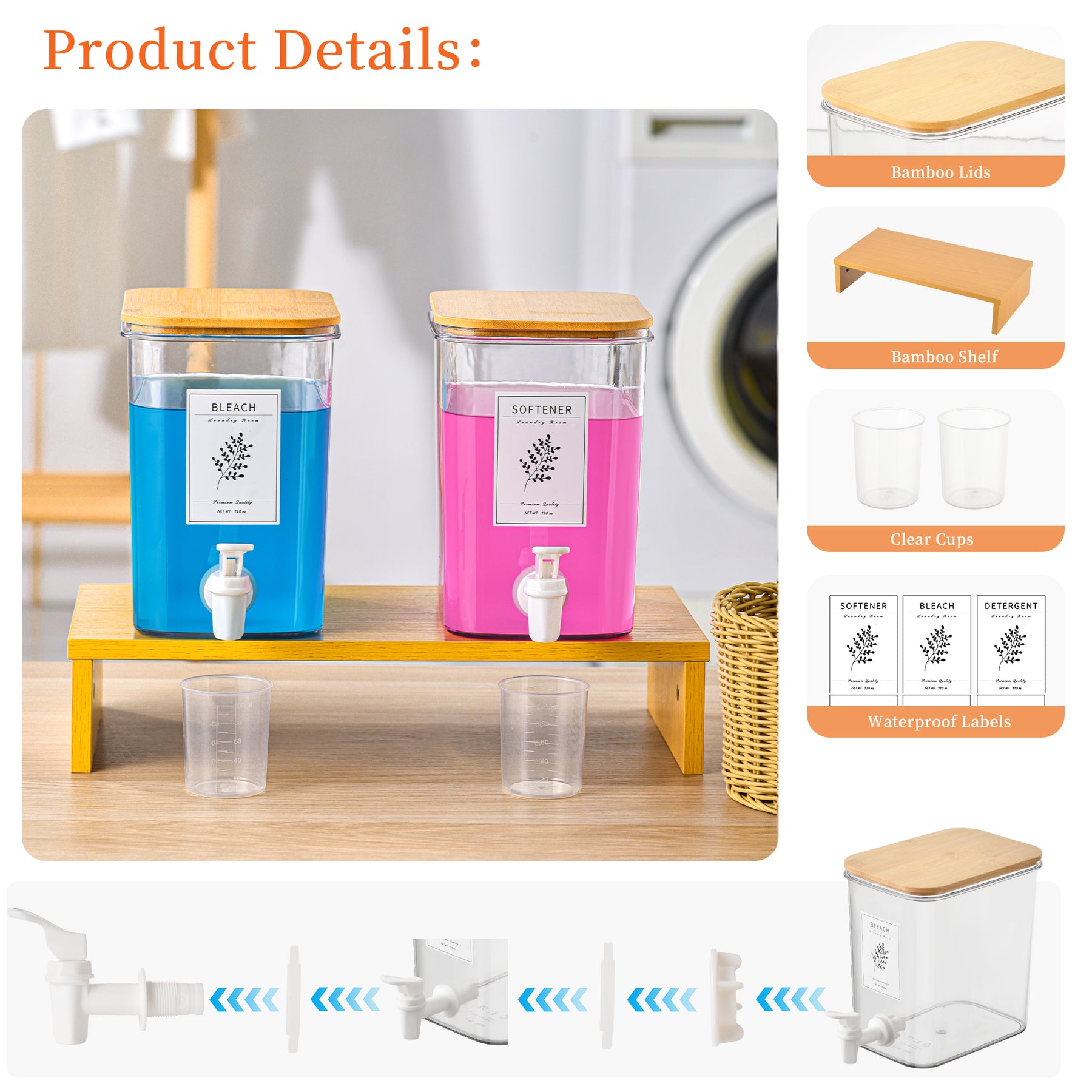 • COMPLETE DISPENSER SET: The liquid laundry detergent dispenser set includes everything you need to organize and decorate your laundry room: 2 x 90 oz dispensers, 2 lids, 6 waterproof labels, 3 taps, 1 wooden shelf, and 3 cups.