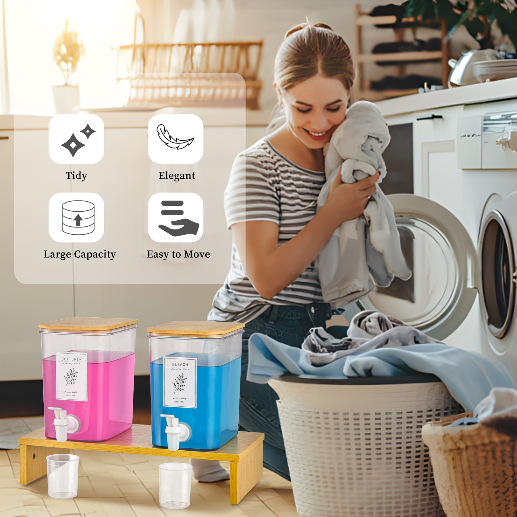 • BAMBOO LID & WOODEN SHELF: Say goodbye to traditional plastic lids. Our laundry soap dispenser features a specially crafted lid and wooden shelf, combining storage with nature. It adds a natural touch to your laundry room while easy storage.